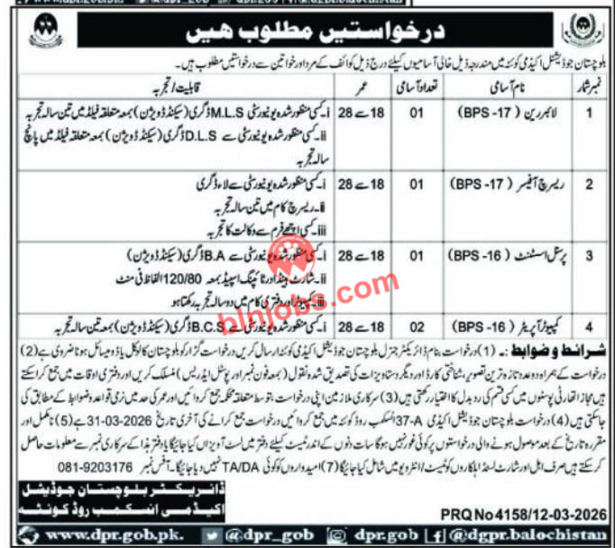 The recent jobs advertisement Balochistan Judicial Academy Quetta Jobs 2026 has published various vacancies in Balochistan 2026. The advertisement provides detailed information about the job titles, required qualifications, experience, and other essential criteria. It is essential for interested candidates to carefully review the advertisement and ensure they meet all the requirements before proceeding with the application process.