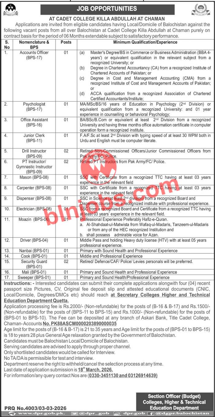 Cadet College Killa Abdullah Jobs 2026 has recently announced job vacancies for Balochistan 2026 in the local newspaper. This is an opportunity for candidates of Balochistan Local Domicile who are seeking employment in the province. The department is inviting applications from the candidates of Balochistan for the following Balochistan jobs 2026. If you meet the eligibility criteria and possess the required skills, this is your chance to apply and get these jobs in Balochistan.