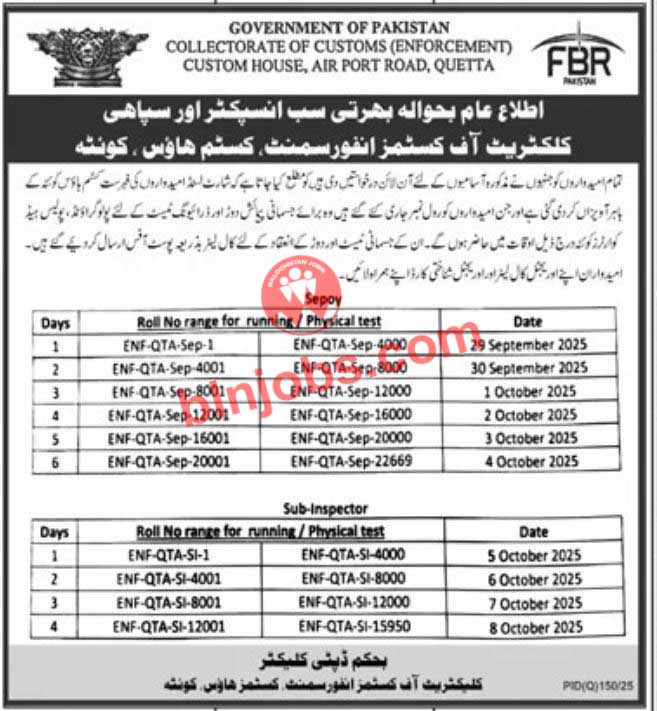 Collectorate of Custom Enforcement Sepoy and Sub Inspector Physical Test recently announced test interviews for the vacant positions that were advertised in a local newspaper. The test and interview schedule of the department is now available, applicants can adequately prepare themselves for the next phase of the selection process. All candidates who have applied for these positions are requested to take note of the following schedule below.