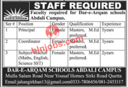 Dar e Arqam School Quetta Jobs 2026 has recently announced job vacancies for Balochistan 2026 in the local newspaper. This is an opportunity for candidates of Balochistan Local Domicile who are seeking employment in the province. The department is inviting applications from the candidates of Balochistan for the following Balochistan jobs 2026. If you meet the eligibility criteria and possess the required skills, this is your chance to apply and get these jobs in Balochistan.