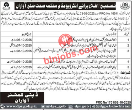 Health Department Awaran recently announced test interviews for the vacant positions that were advertised in a local newspaper. The test and interview schedule of the department is now available, applicants can adequately prepare themselves for the next phase of the selection process. All candidates who have applied for these positions are requested to take note of the following schedule below.