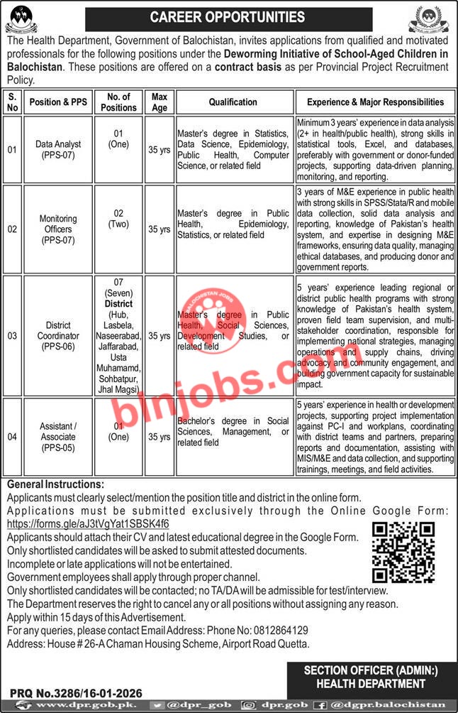 Latest Jobs in Health Department Deworming Initiative of School Aged Children Balochistan 2026| IMPORTANT LINKS
