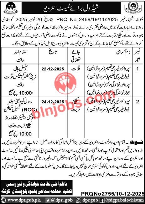 Literacy and Non Formal Education Test Interviews 2025 recently announced test interviews for the vacant positions that were advertised in a local newspaper. The test and interview schedule of the department is now available, applicants can adequately prepare themselves for the next phase of the selection process. All candidates who have applied for these positions are requested to take note of the following schedule below.