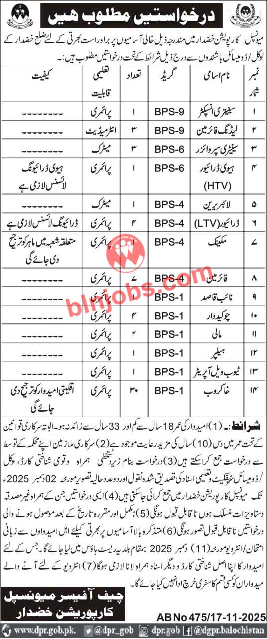 Municipal Corporation MC Khuzdar Jobs 2025 has recently announced job vacancies for Balochistan 2025 in the local newspaper. This is an opportunity for candidates of Balochistan Local Domicile who are seeking employment in the province. The department is inviting applications from the candidates of Balochistan for the following Balochistan jobs 2025. If you meet the eligibility criteria and possess the required skills, this is your chance to apply and get these jobs in Balochistan.