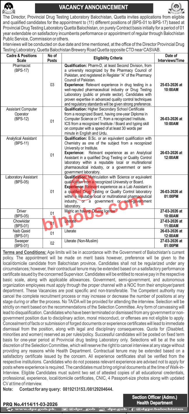 Provincial Drug Testing Laboratory Balochistan Jobs 2026