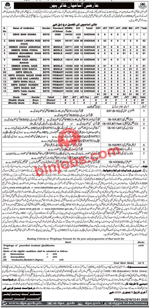 Latest Jobs in School Education Department Sherani 2026| IMPORTANT LINKS