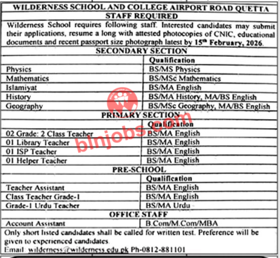 Latest Jobs in Wilderness School and College Quetta 2026| IMPORTANT LINKS